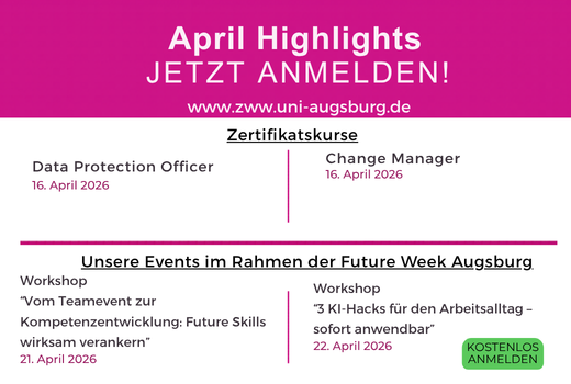 Der April steht ganz im Zeichen der Zukunft! Unsere bewährten Zertifikatskurse Change Manager/-in und Data Protection Officer starten diesen Monat. Zusätzlich erwarten Sie im Rahmen der FUTURE WEEK Augsburg zwei spannende Workshops rund um die Arbeitswelt von morgen.